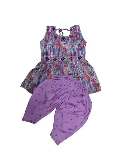 Add color and comfort to your little girl’s wardrobe with this stylish two-piece frock and pant set. The multicolor printed frock features a sleeveless design with tie-back detail, paired with a soft lilac pant adorned with tiny heart prints. Made from a durable synthetic blend, it ensures both comfort and vibrant style — perfect for casual outings or festive gatherings.